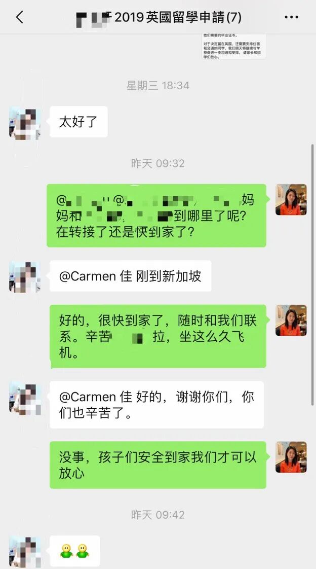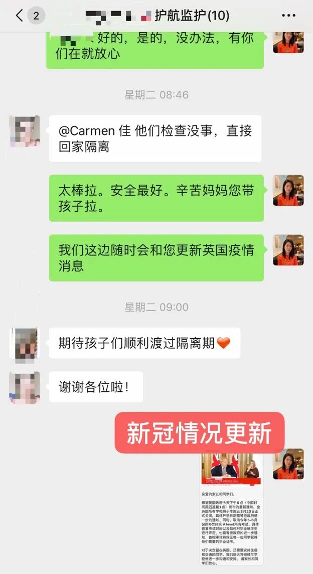 责任保驾 爱心护航 | 疫情之下 我们在行动发表时间:2020-11-13 16:26来源:原创 “患难见真情!” “护航大家长” “真心感谢你们的付出” “你们辛苦了”…… 这是这段时间以来,我们监护团队听到最多的反馈,也是家长和同学们对我们工作的支持和鼓励。 身在疫情最为严重的伦敦市中,在过去的20天里,护航教育全员居家办公,从早到晚、满负荷地协助家长和同学们做好离校、离境的安排,并配合学校做好后续工作。